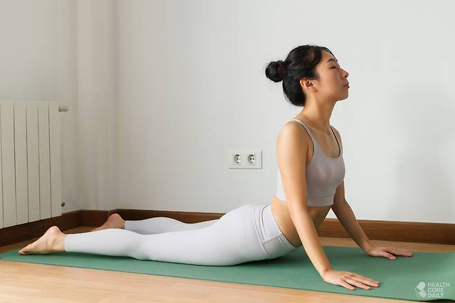 코브라 자세는 허리에 부담이 가지 않게 천천히 진행하는 게 가장 중요하다. 통증이 생기면 중단하고, 척추 질환이 있다면 무리하지 않는 선에서 조심스럽게 시도해야 한다.