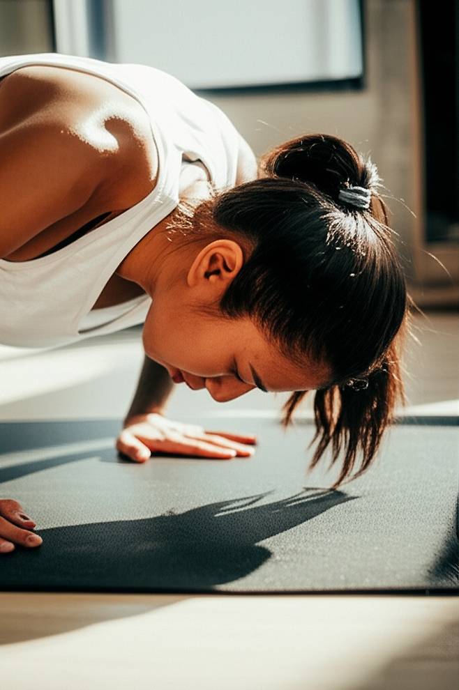 4. 팔꿈치를 굽히며 머리가 바닥에 닿기 직전까지 천천히 내려갑니다. 이때 머리가 손보다 살짝 앞쪽에 위치하도록 합니다.