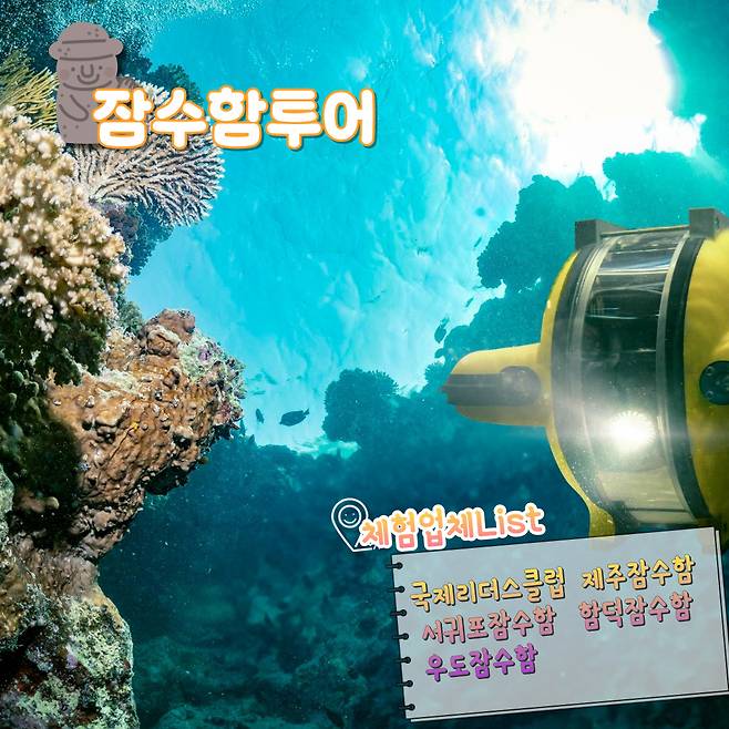 아이들에게는 눈이 즐겁고, 어른들에게는 입이? 즐거워질 수 있는 잠수함 투어를 통해 즐거은 추억을 쌓아보시길 바랍니다. 서귀포, 우도, 함덕 등 제주 곳곳에서 잠수함 투어를 운영하니 참고하세요.