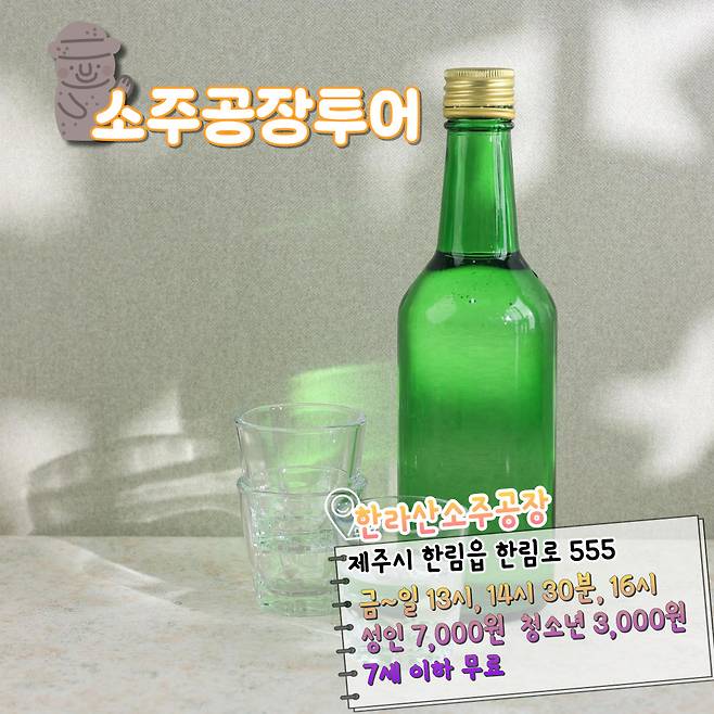 제주를 대표하는 ‘한라산 소주’가 어떻게 만들어지는지 직접 보고, 시음까지 할 수 있는 알찬 제주도 이색 체험 프로그램! 술을 좋아하는 어른들에게는 흥미로운 체험이자, 제주도의 술 문화를 배울 수 있는 기회가 될 거예요. 소주 시음을 할 수 없는 어린이들에게는 감귤주스와 차가 제공되니 걱정말고 체험에 참여해보세요!