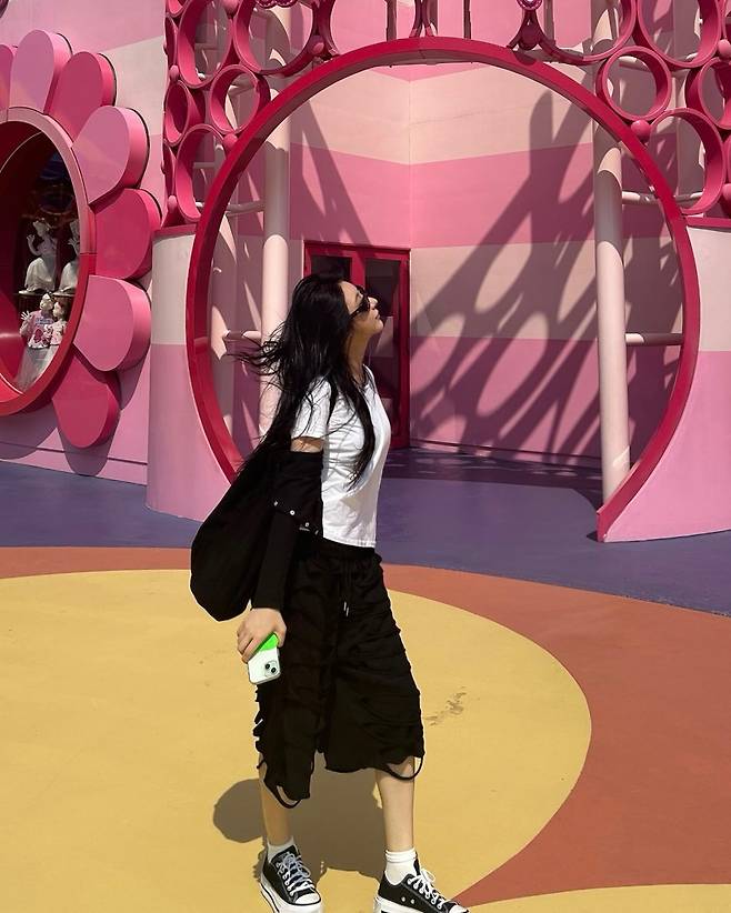 스타일링의 인상은 ‘가벼운 속도감’이다. 허리·엉덩이 라인을 과하게 드러내지 않으면서도 셔링이 만들어낸 곡선으로 글래머러스한 볼륨을 암시하고, 발목과 종아리 라인을 깨끗이 드러내 여름 특유의 경쾌함을 살린다. 햇빛 아래서 더 또렷해지는 블랙 앤 화이트의 대비는 배경 색이 강한 공간에서도 사진이 ‘사라지지 않는’ SNS 친화적 해법이기도 하다.