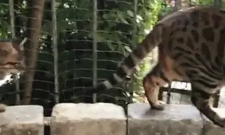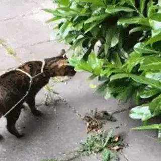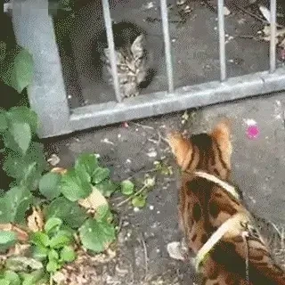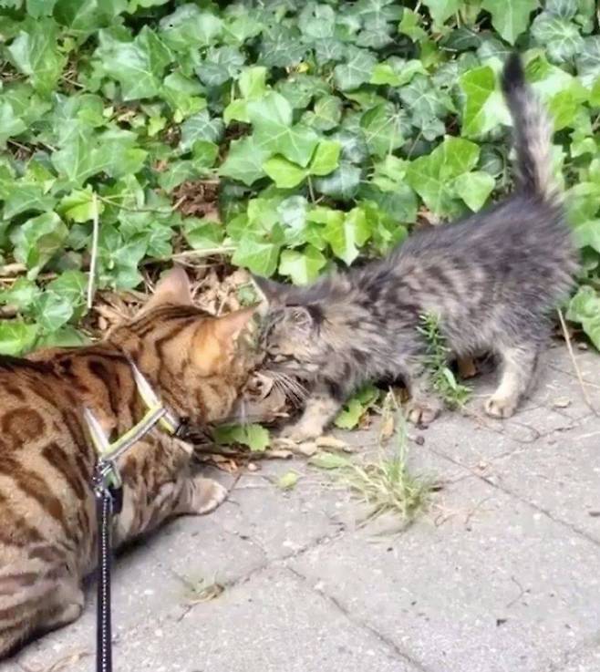 그 순간, 겁먹었던 아기 고양이는 반려묘를 믿고 졸졸 따라다니기 시작했습니다.