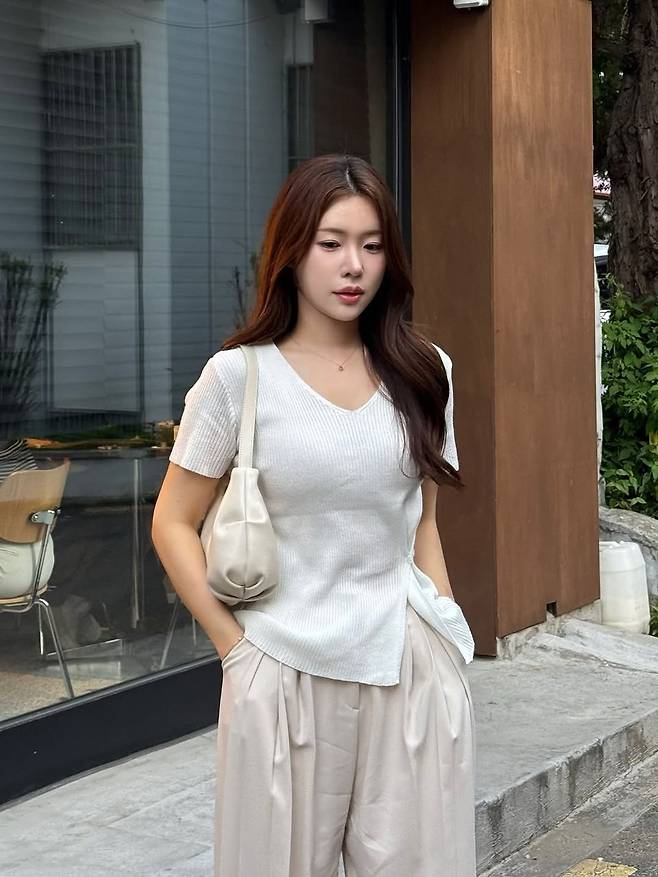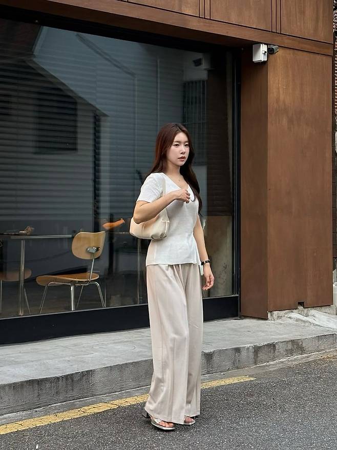 상의는 바디에 부드럽게 밀착되는 립조직의 브이넥 니트로, 쇄골 라인을 자연스럽게 드러내며 여성스러운 실루엣을 완성했다. 니트는 허리 라인에서 살짝 퍼지는 컷으로 제작돼 활동성과 스타일을 동시에 잡았다. 팬츠는 실키한 소재의 와이드 핏으로, 은은한 베이지 톤이 고급스러움을 더한다. 허리부터 자연스럽게 흐르는 주름 디테일이 체형을 보완하고, 포멀하면서도 편안한 인상을 준다.