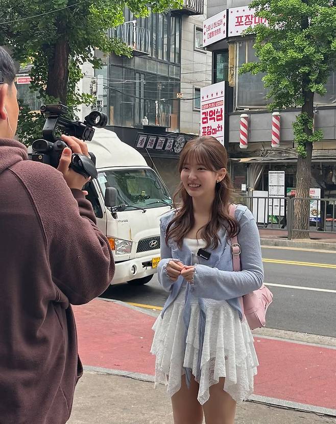 가슴에 부착한 마이크 장비와 손에 든 도시락 박스는 콘텐츠 촬영 중이라는 자연스러운 상황을 드러내며, 오히려 현실적인 연출로 더욱 친근한 매력을 끌어올렸다. 댓글 창에는 “진짜 여친짤이다”, “드라마 속 첫사랑 그 자체” 등의 반응이 이어졌다.