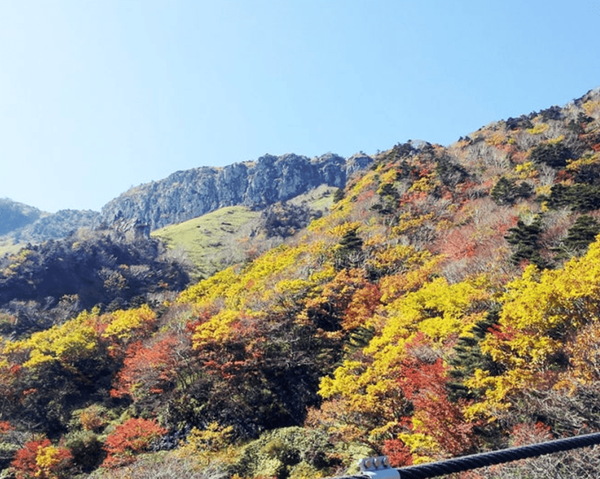 영실코스나 성판악코스는 10월 산행에 특히 인기가 많습니다. 구불구불 이어진 등산로를 따라 걷다 보면, 바람에 흩날리는 낙엽이 눈처럼 흩어지고, 멀리 바다까지 이어지는 풍경이 한눈에 들어오는데요. 산과 바다가 동시에 펼쳐지는 장면은 한국 어디에서도 보기 힘든 한라산만의 특별한 매력입니다.