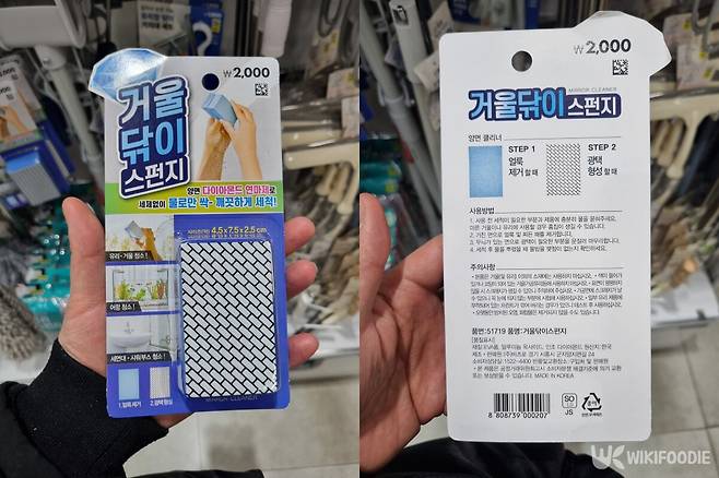 다이소의 거울 닦이 스펀지는 욕실에서 자주 발생하는 물때와 얼룩을 손쉽게 제거할 수 있는 제품이다. 이 스펀지는 EVA 폼, 알루미늄 옥사이드, 인조 다이아몬드 재질로 제작돼 유리나 거울의 오염을 쉽게 제거할 수 있다.