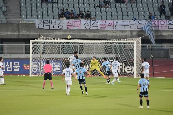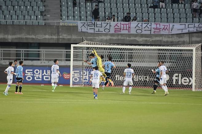 김태완 감독이 이끌고 있는 천안시티 FC가 1일 오후 7시 천안 종합운동장에서 벌어진 2025 K리그2 인천 유나이티드 FC와의 홈 게임에서 돌아온 골잡이 이정협의 2골 활약에 힘입어 3-3으로 비겼다.