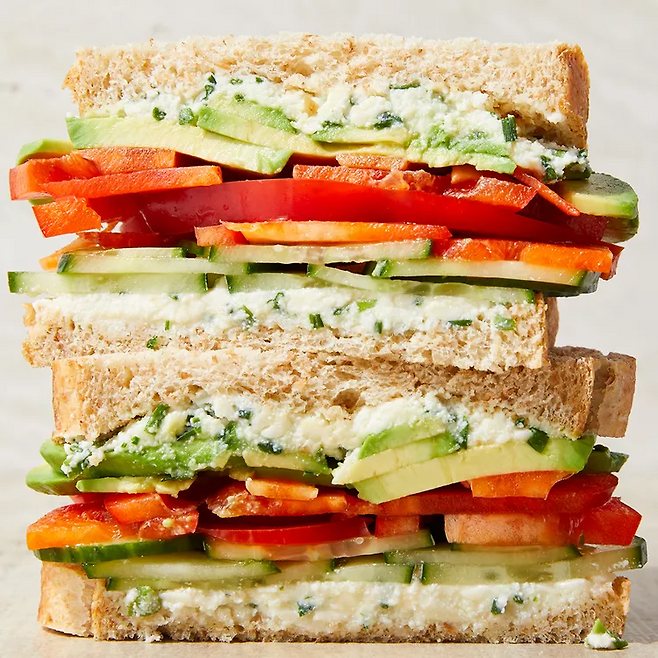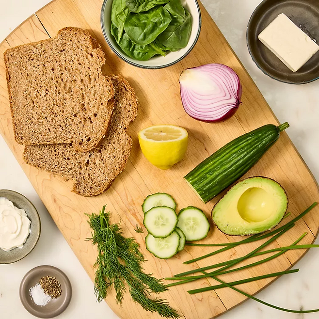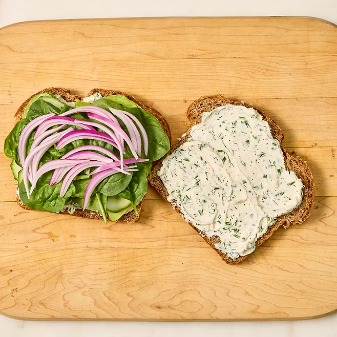 구운 식빵 한쪽 면에 준비한 크림치즈 스프레드를 고르게 펴 바릅니다. 그 위에 아보카도 ½개(슬라이스), 오이 ⅓컵, 시금치 ¼컵, 잘게 썬 적양파 1큰술을 올려 주세요. 마지막으로 레몬즙 1작은술을 뿌려 상큼함을 더합니다.