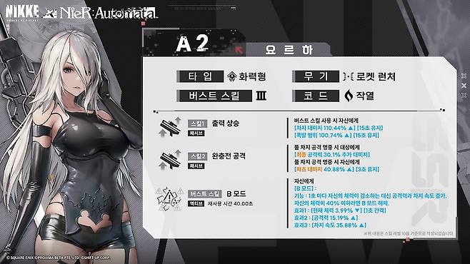 A2는 원작에도 있던 무기 '40식 참기도'를 들고 참전합니다. '니케'에서는 로켓 런처로 분류되며, 홍련에 이어 검으로 원거리 공격을 하는 캐릭터입니다. 타입은 화력형으로 버스트 스킬 사용 시 일정 시간 동안 차지 대미지 증가와 폭발 범위 증가 효과를 부여하는 '출력 상승', 매초 체력이 감소하는 대신 공격력과 차지 속도가 증가해 대미지 딜링 능력을 높여주는 버스트 스킬 'B 모드'가 핵심 스킬로 보입니다.