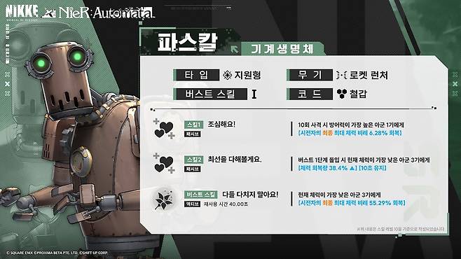 파스칼은 '개조 총기'라는 이름의 로켓 런처로 전투에 임합니다. 총기에도 작은 기계생명체가 타고 있는데, 실질적인 공격은 이 기계생명체가 대신하는 느낌입니다. 타입은 지원형으로 스킬도 모두 회복 스킬로 구성되어 있습니다. 스킬1이 풀차지, 명중 여부와 상관없이 발동되기에 쓰고 싶다면 장탄 수를 10발 이상으로 늘린 다음 차지 없이 바로바로 발사하면 탱커의 빠른 회복을 노려볼 수 있을 듯합니다. 로켓 런처 특성 상 빠른 버스트 게이지 충전도 함께 노려볼 수 있고요. 스킬2와 버스트 스킬의 조합으로 대량 회복이 가능하다는 것도 장점이겠네요. SR 등급이라 자주 쓰진 않겠지만, 굳이 쓰려면 쓸 수는 있는 성능이지 않을까 싶습니다.