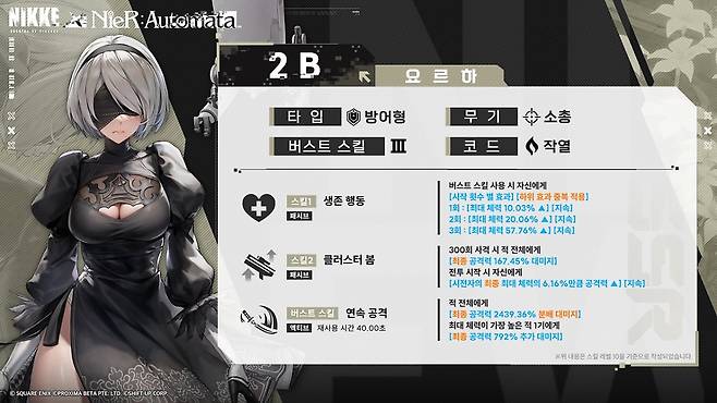 2B는 원작과 달리 '백포'라는 이름의 소총(AR)을 들고 싸웁니다. 원작에서는 포드가 사격을 전담하기에 볼 수 없는 2B의 사격 자세를 '니케'에서 처음으로 볼 수 있는 셈이죠. 타입은 방어형으로 버스트 스킬을 사용할 때마다 최대 체력이 증가하고, 증가한 최대 체력에 따라 공격력이 증가하는 특징을 가집니다. 특히, 스킬2와 버스트 스킬이 적 전체에게 대미지를 주는 것들이라 최대 체력을 늘려주는 니케와 함께 활용하면 방어형임에도 높은 화력을 낼 수 있을 것으로 보입니다.