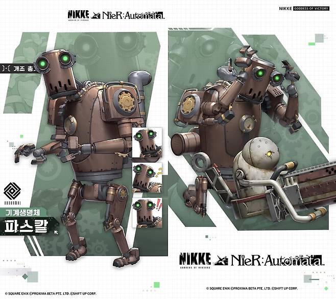 '니케'의 세계에 모습을 드러낸 이들은 요르하 부대 소속 안드로이드 2B와 9S, 요르하 부대를 탈주한 안드로이드 A2, 평화를 사랑하는 기계생명체 파스칼의 4명입니다. 이중 9S는 남성 캐릭터라 플레이어블 캐릭터로는 사용하지 못하지만, 일단 스토리에서는 활약을 할 것으로 보입니다.