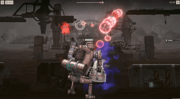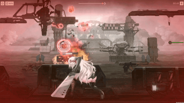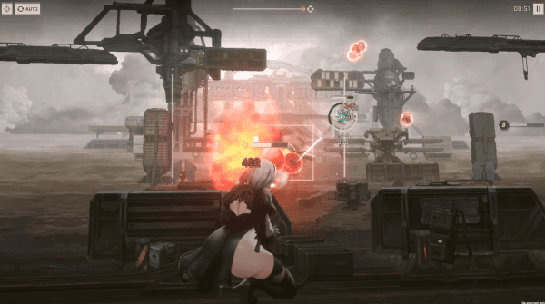 UI도 니어: 오토마타의 느낌으로 바뀌었는데요, 캐릭터의 HP 표시, 대미지 수치 표시, 장탄 수 표시와 재장전 알림 팝업, 원작에서 포드 사격 시 보이는 UI까지 재현한 이벤트 스테이지의 UI 변화는 정말 깜짝 놀랐습니다. 여기에 적들이 쏘는 탄환도 원작을 그대로 재현하고 있어서 원작 분위기가 물씬 풍기죠. 과연 "원작의 경험과 추억을 느낄 수 있도록 했다."라고 호언할 만합니다.