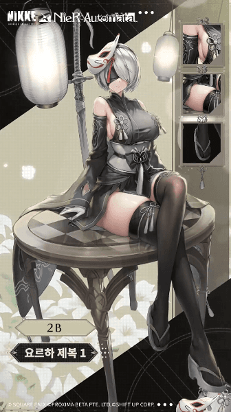 추가 코스튬은 스커트를 제거한 버전의 '중파상태', 원작의 DLC 특전을 재현한 '요르하 제복 1'의 두 가지입니다. 중파상태는 2B 입수와 함께 추가되며, 요르하 제복 1은 유료 코스튬 구매 방식 중 하나인 '코스튬 픽'으로 획득이 가능합니다. 가격이 꽤 나가는 만큼, 신규 음성과 스킬 컷신, 스탠딩 포즈, SD 특수 모션이 포함되니 2B를 뽑았다면 함께 노려봅시다.