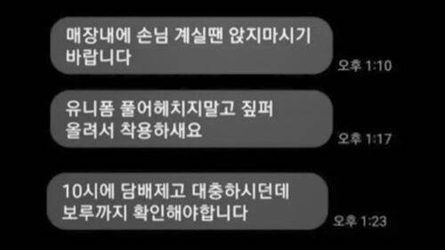 지나가는 누구도 눈길을 준다, 하지만 안에서는 하루가 다르게 알바생이 바뀐다. 최근 온라인 커뮤니티에 공개된 어느 편의점 사연이 모두를 충격에 몰아넣었다. 1년 동안 무려 169번이나 아르바이트생을 새로 뽑은 한 매장. 알바생 평균 근속일이 ‘2일’ 남짓이라는 뜻이다. 그 전설은 점주의 집요할 정도로 세세한 지시 메시지에서 시작된다. “손님 계실 땐 절대 앉지 마라”, “유니폼은 꼭 지퍼 올려서”, “담배 재고는 보루까지 확인해야 한다”, “카운터에서 취식 금지”, “근무지침을 꼭 다시 한번 봐라”… 이런 문자들이 2~7분마다 도착했고, 알바생은 즉각 “알겠습니다”로 답했지만, 결국 “오늘까지만 하시고 근무 그만두라”는 해고 통지로 끝을 맺었다.