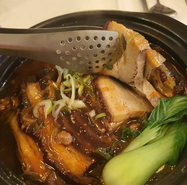 특히 동파육은 입안에서 부드럽게 녹는 식감과 은은한 향신료가 어우러져 매력적이다. 이와 함께 나오는 가지와 청경채는 함께 먹으면 아주 깔끔한 맛을 선사한다. 동파육은 특이하게도 길게 슬라이스되어 나오는데, 한입 물면 야들야들하고 부드러우면서도 풍미가 깊은 맛을 느낄 수 있다.