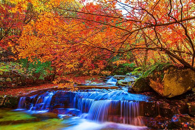 방동계곡은 폭포수처럼 세차게 흐르는 계곡물 주변으로, 형형색색으로 물들여진 단풍을 구경할 수 있는 자연 명소입니다.