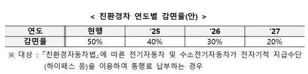 친환경차 통행료 감면율, 2027년까지 단계적 축소