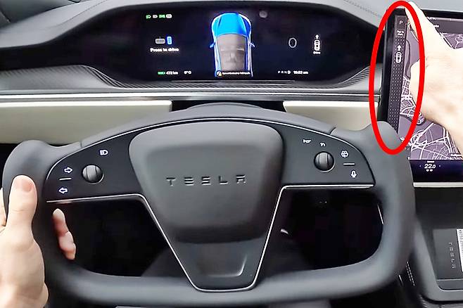 한편 테슬라 모델 S와 X, 모델 3 리프레시 모델은 물리적 형태의 변속 장치가 없다. 전원이 켜지면 차량 스스로 전후방 장애물 및 내비게이션 도로 방향 등을 종합적으로 판단해 진행 방향을 결정한다. 혹은 운전자가 센터 디스플레이 좌측의 슬라이딩 바를 밀어서 진행 방향을 결정할 수도 있다. 디스플레이 고장으로 이를 조작할 수 없는 경우에는 센터패시아 하단의 임시 조작용 터치 패드가 활성화된다.