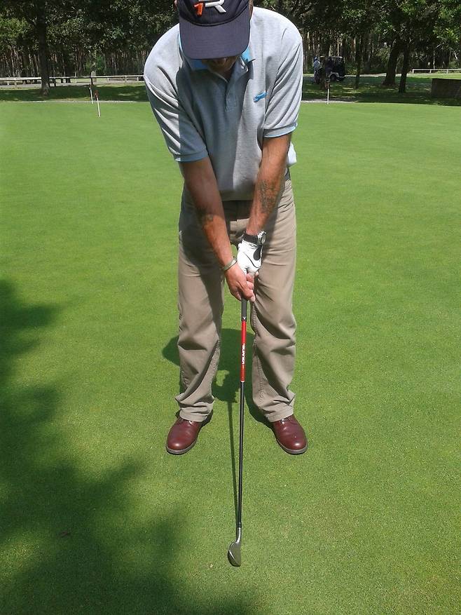 짧은 샷을 칠 때는 손을 어깨 바로 아래에 두는 게 좋습니다. 바운스를 제대로 활용하려면 적절하게 셋업을 해야 합니다. 우선 그립을 중앙에 위치하세요. 지면과 수직이 되도록 설정한 후 발 중앙에 샤프트를 배치합니다. 클럽 샤프트가 너무 앞으로 기울어지면 클럽이 지면을 파고들 가능성이 높습니다.