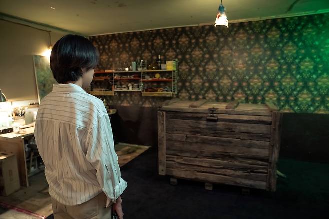 작업실 내부에서 보이는 콘크리트, 식물 덩굴과 꽃이 어우러진 벽지, 둥그런 알 형태의 거울과 조명 등이 전은숙 미술감독의 고민에서 나오게 된 <뒤주>의 디테일한 설정이죠.