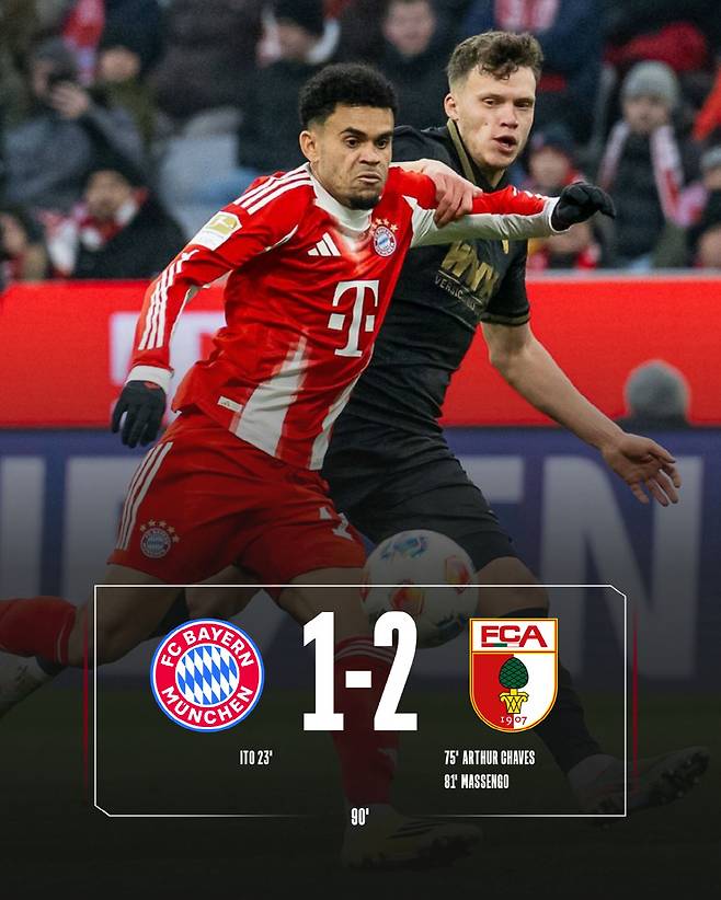 뮌헨은 24일(한국시각) 독일 뮌헨의 알리안츠 아레나에서 열린 아우크스부르크와의 2025~2026시즌 독일분데스리가 19라운드 홈 경기에서 1대2 역전패했다.