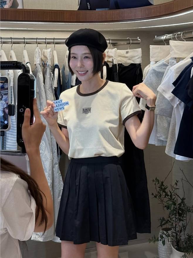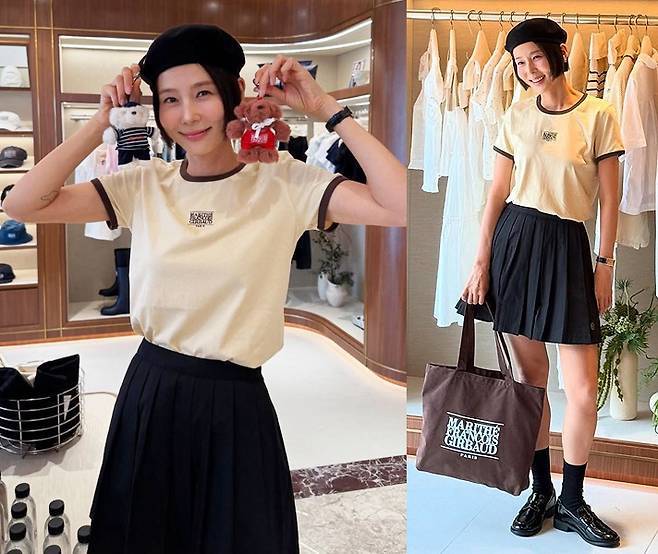 아이보리 배색 티셔츠에 블랙 플리츠 미니스커트를 매치해 상큼하면서도 고급스러운 무드를 선보였습니다.