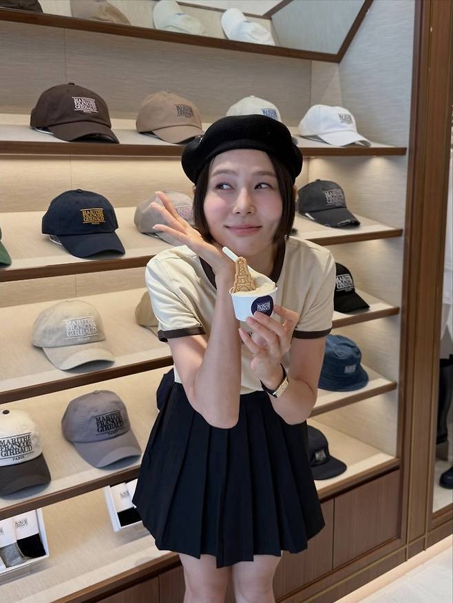 시그니처처럼 자리 잡은 베레모를 활용해 소녀미를 배가시켰고, 깔끔한 블랙 로퍼와 양말 조합으로 프렌치 시크 무드를 완성했습니다.