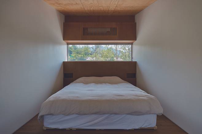 숲 복도를 지나 처음으로 만나는 생활공간은 주방과 식당이다. 단층집의 외부에서 보면 굴뚝처럼 보이는 솟아 있는 구조물은 빛의 잠망경이다. 천창을 통해 반사돼 들어오는 자연광은 응접실의 조명을 대신한다. 충분한 깊이를 가진 프레임에 담긴 하늘은 집 안에서 흡사 공간과 빛의 마술사라 불리는 제임스 터렐의 작품을 감상하는 비일상적인 경험을 선사한다.