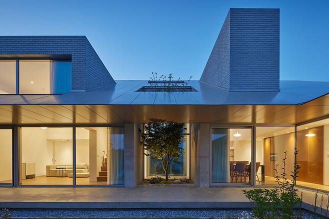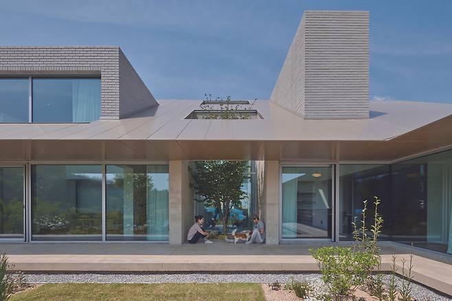 마당으로 길게 뻗은 지붕은 집의 모든 곳을 이어주는 툇마루에 깊은 처마를 만든다. 2m가 넘는 처마는 마당에 내부 공간만큼이나 큰 머무름의 공간을 만든다. 자연과 가장 가깝게 맞닿은 처마 아래는 계절을 담는 시간의 공간이다. 햇살이 화창한 날에는 빛을 반사하는 금속 복합패널 마감의 처마가 시시각각으로 변하는 빛을 산란시켜 콘크리트 툇마루에 너울거리는 그림자를 만든다.