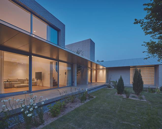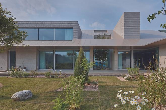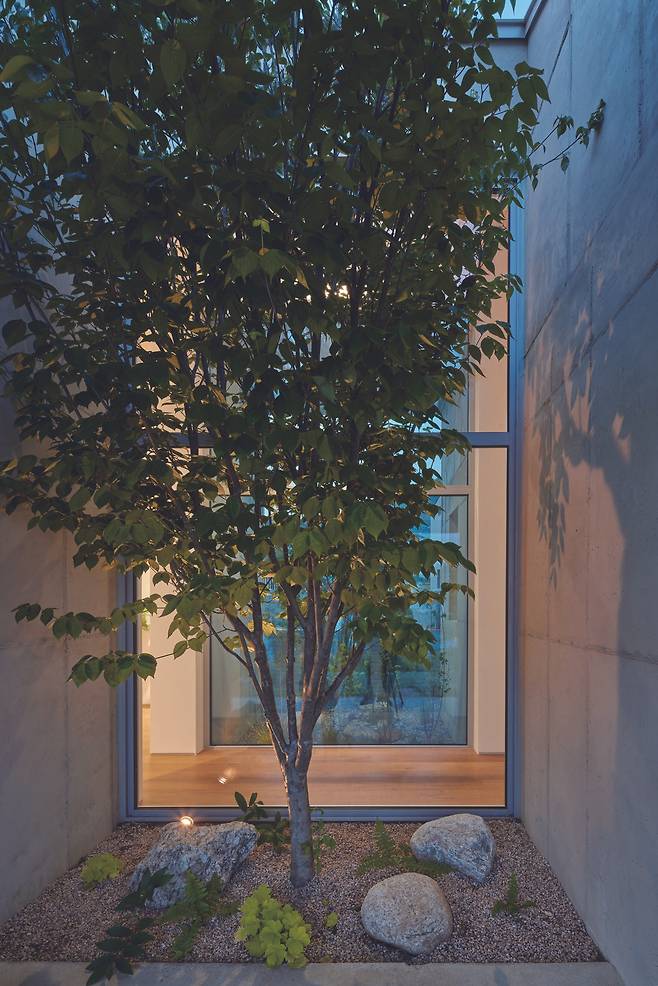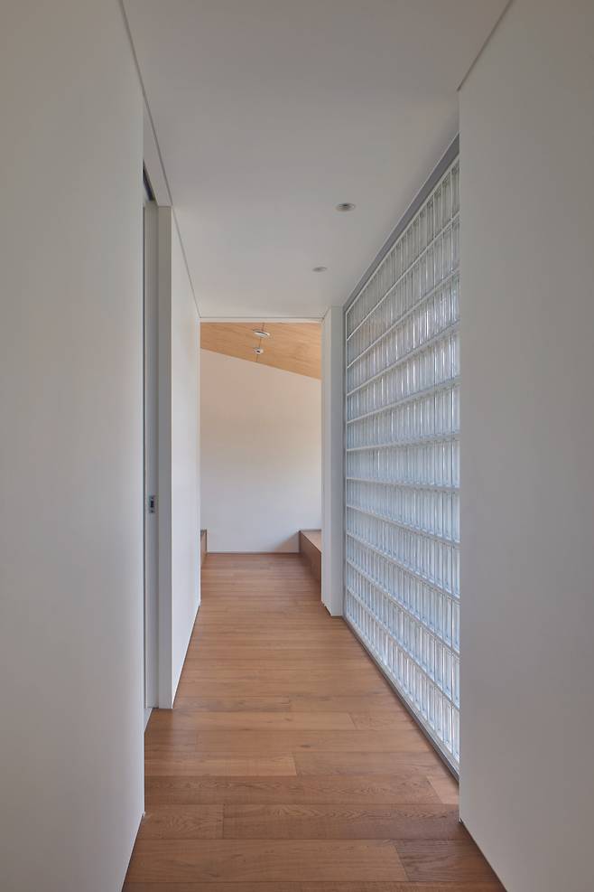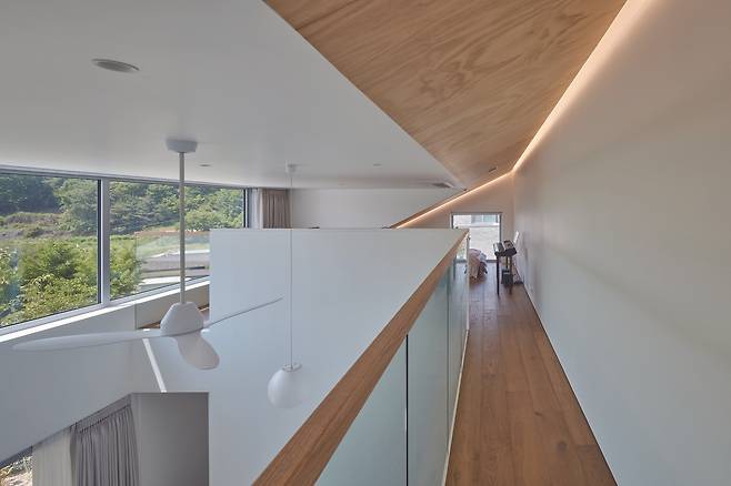 집의 배경이 되는 산과 집으로 둘러싸인 마당을 연결하는 복도는 거실과 생활공간을 이어준다. 복도에는 땅에서 하늘까지 이어지는 커튼월의 큰 창을 계획하고, 숲 속을 거니는 것처럼 양 옆에 큰 나무를 심었다. 복도를 지나면서 먼 산과 마당의 가까운 정원을 동시에 경험할 수 있도록 했다. 내부이지만 외부와 같은 개방감으로 계절의 변화를 자연을 통해 느낄 수 있게 했다.