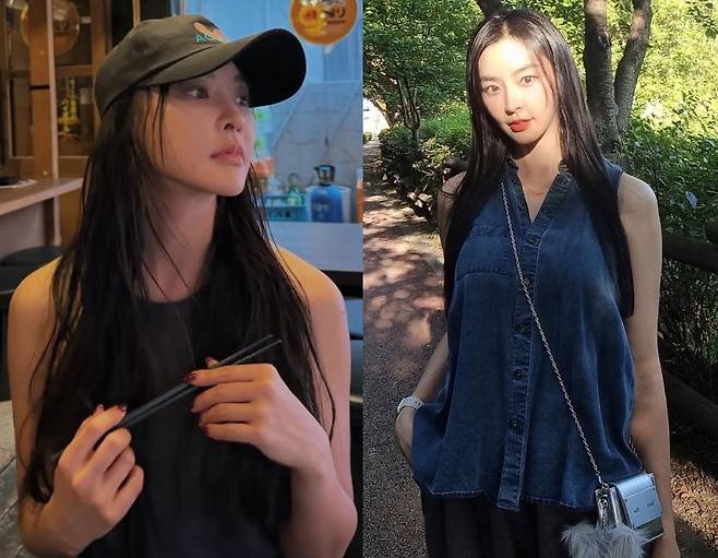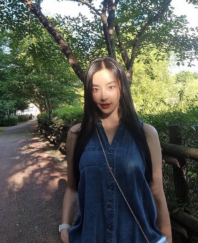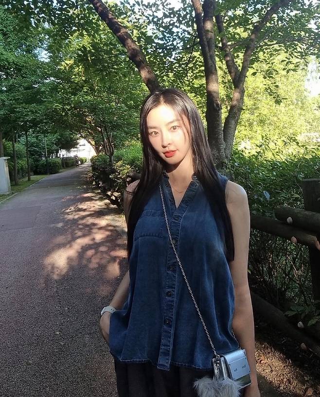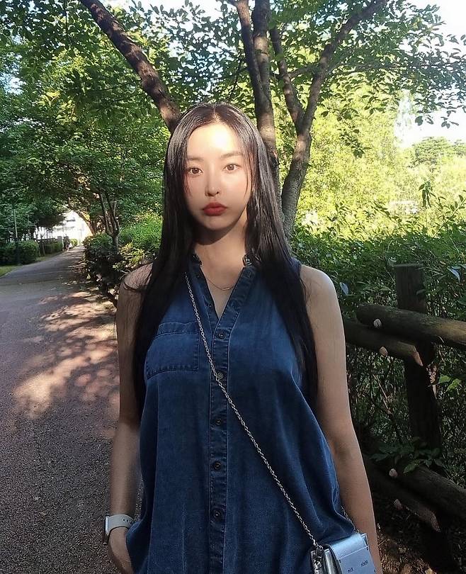 데님 민소매 셔츠에 미니 크로스백을 더해 캐주얼하면서도 세련된 분위기를 완성했습니다.