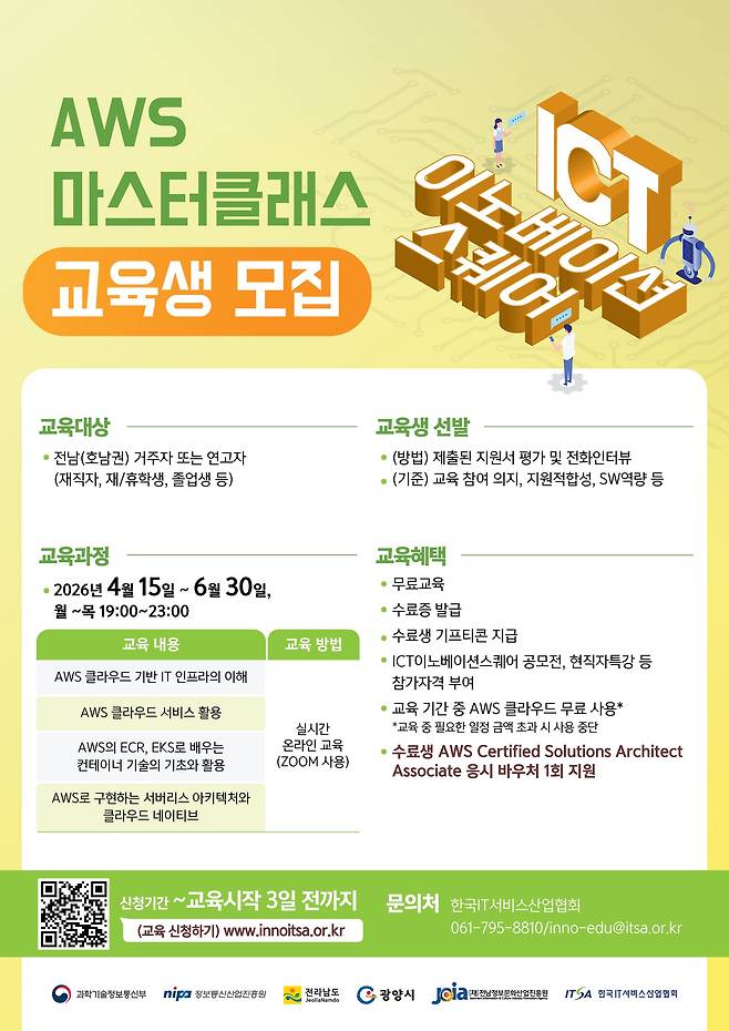 과학기술정보통신부와 정보통신산업진흥원이 주관하고 전라남도와 광양시가 지원하는 ‘ICT이노베이션스퀘어 확산사업’의 일환으로 운영되는 이번 교육은 AWS 클라우드 기반 인프라와 서비스 활용, 컨테이너 기술, 서버리스 아키텍처 등 핵심 실무 내용을 중심으로 구성된 인공지능(AI) 분야 중급과정이다.