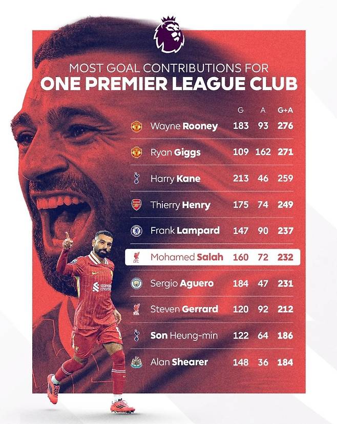 이 기록의 최상단에 위치한 건 맨체스터 유나이티드의 전설 웨인 루니다. 프리미어리그에서는 에버턴과 맨유에서만 뛰었던 루니는 맨유에서 183골 93도움을 기록했다. 이는 커리어 내내 맨유에서만 활약한 라이언 긱스(109골 162도움)보다 더 많은 기록이다.