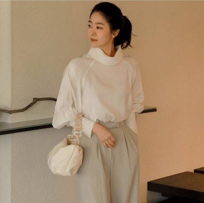 구조감 있는 하이넥 블라우스와 핀턱 슬랙스를 매치해 차분하면서도 세련된 인상을 주었습니다.