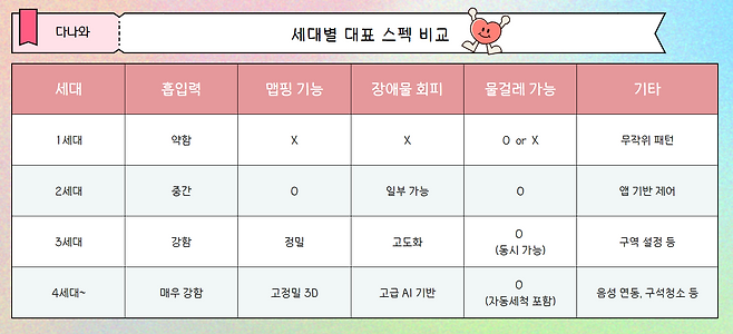 그리고 요즘 우리가 사용하는 것들은 4세대라고 할 수 있다. 우리집 로봇청소기 3호 "삼룡이(모델명에 3이 들어간다)"는 청소 후 자동으로 걸레를 빨고 말려준다. 주인이 손 하나 까딱하지 않아도 되는 거다. 이 정도면 로봇청소기를 쓰지 않는 게 더 이상한 시대가 되었다.