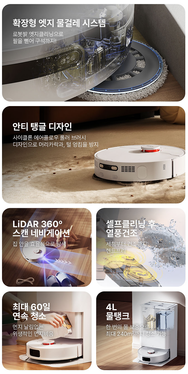 이 가격에 이게 된다고?? 해킹 툴이라도 심어진 거 아니야? 라고 의심까지 할 정도다. 흡입력도 8,000Pa로 강력하며, 구석까지 꼼꼼하게 닦아내는 엣지 물걸레 기능은 고가 모델 부럽지 않다. 스테이션도 있어 먼지통 비움과 걸레 빨래까지 알아서 해준다.