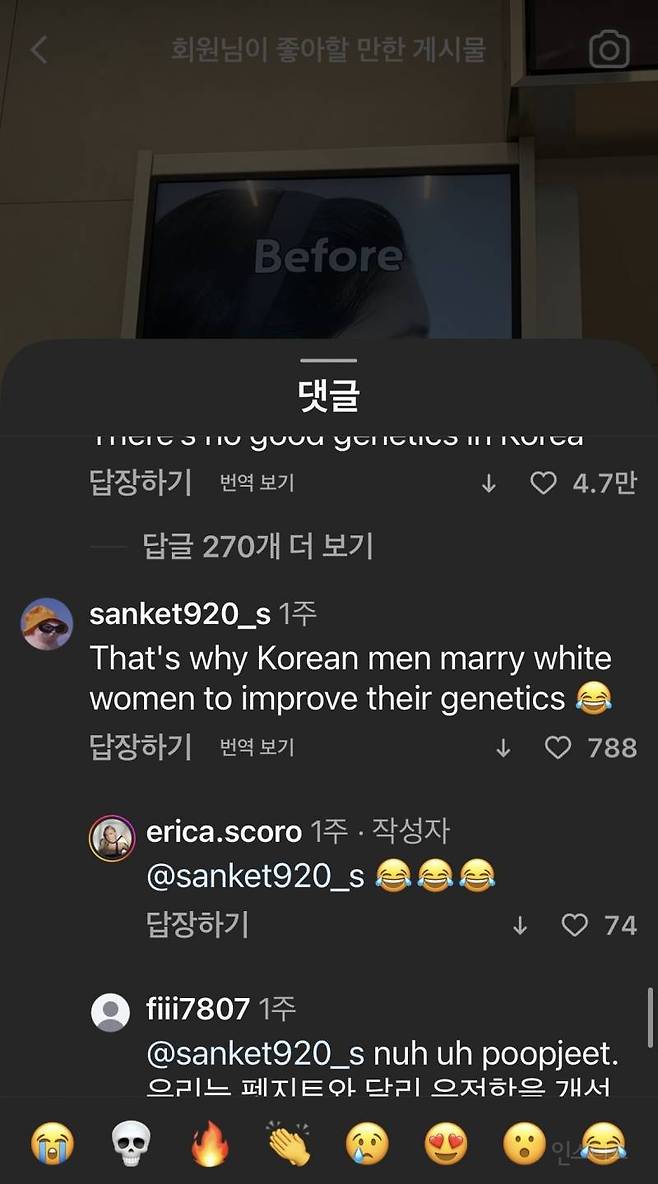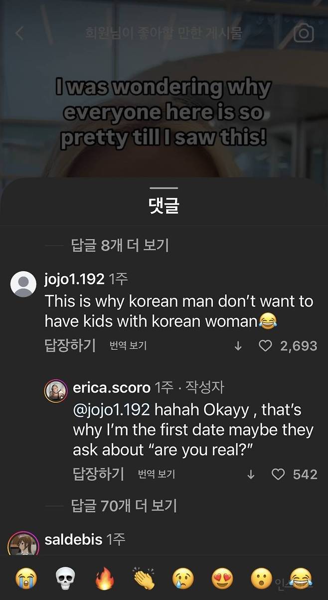 한국남자가 유전자 개량하려고 백인여자랑 결혼하는거라는 댓에는 웃는임티 달고 한국남자가 한국여자랑 아이 안갖고싶어하는 이유라는 댓글에는 자기가 한국남자랑 데이트한썰 풀면서 공감함..ㅋㅋ 한국남자를 아주 사랑하시는 분인가봄