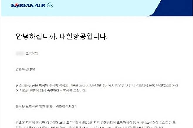 대한항공은 해당 승객에게 치료비 10만 원과 전자 우대 할인권을 제공하며 공식적으로 사과했습니다. 대한항공 측은 이메일을 통해 "불량 유리컵 검수 미비로 인해 상해를 입으실 뻔한 점에 진심으로 사과드린다"고 전했으며, 검수 절차를 강화하고 승무원들이 유리컵을 재확인하도록 조치하겠다고 밝혔습니다.