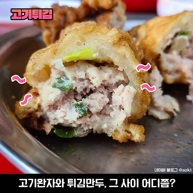 1인분을 시키면 기다란 모양의 고기튀김이 2개 나오는데, 이게 또 먹기 좋게 잘라져서 나와요. 두툼한 비주얼을 자랑하며, 1인분 치고 적지 않은 편이구요. 한입 베어무는 순간 육즙이 팡! 고기와 부추가 맛있게 어우러져 안주로도 제격이에요. 비슷한 맛을 찾자면 고기완자와 튀김만두 그 사이 어디쯤?