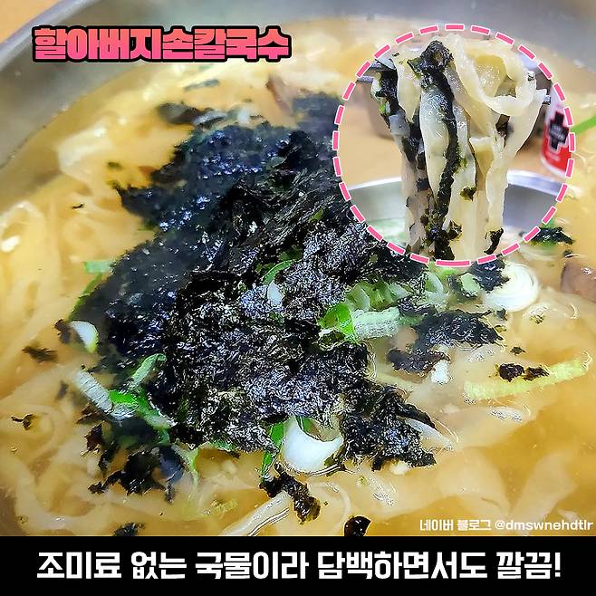 마지막으로 소개해드릴 할아버지손칼국수 역시 30년 전통의 칼국수 전문점인데요. 조미료 없는 국물이라 담백하면서도 깔끔한 맛이 특징이에요.