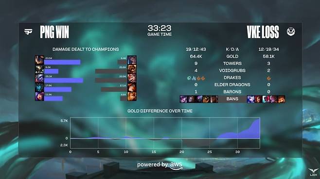 그리고 다음 드래곤 한타에서도 상대보다 나은 한타 능력을 선보인 페인 게이밍이 드래곤 영혼까지 손에 넣으며 경기 시간 33분 만에 바이킹스의 넥서스를 파괴하며 1:0을 만들었다.