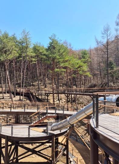 산책로가 높은 곳에 설치되어 있어 높게 자란 나무와 눈맞춤을 하며 싱그러운 산책을 즐기기 좋습니다. 전망대 인근에 조성된 숲놀이터는 상시 무료 개방되어 있는 시설인데요. 짚라인과 네트 트램폴린, 미끄럼틀 등 시설이 있어 자연 속 즐거운 시간을 보내기에도 좋습니다.