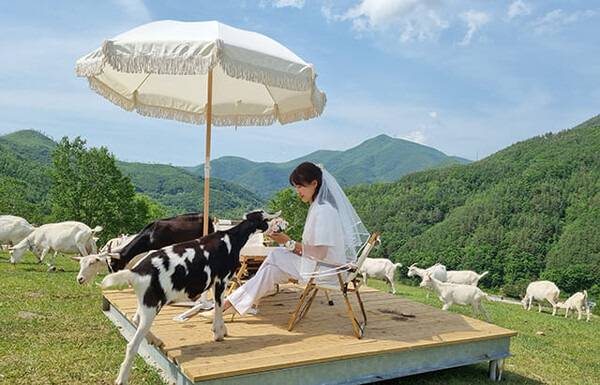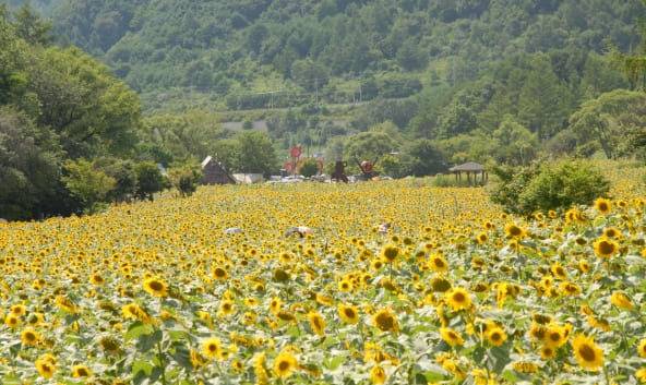 울창한 산과 숲 사이에 둘러싸인 드넓은 언덕이 전부 해바라기로 채워져 장관을 이룹니다. 축제 기간에 방문하면 보다 다채로운 체험과 볼거리가 펼쳐집니다. 7월에는 그림전시회와 버스킹 공연이 마을 곳곳에서 열리는데요. 숲 해설과 산양 먹이주기 체험, 해바라기 악세사리와 해바라기 기름 등 보다 풍성하게 축제를 즐길 수 있습니다.