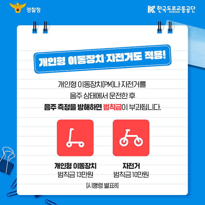 또한 개정 시행령에 따라 개인형 이동장치(예: 전동킥보드) 및 자전거 운전 중 음주 측정을 방해한 경우, 각각 13만 원과 10만 원의 범칙금이 부과된다.