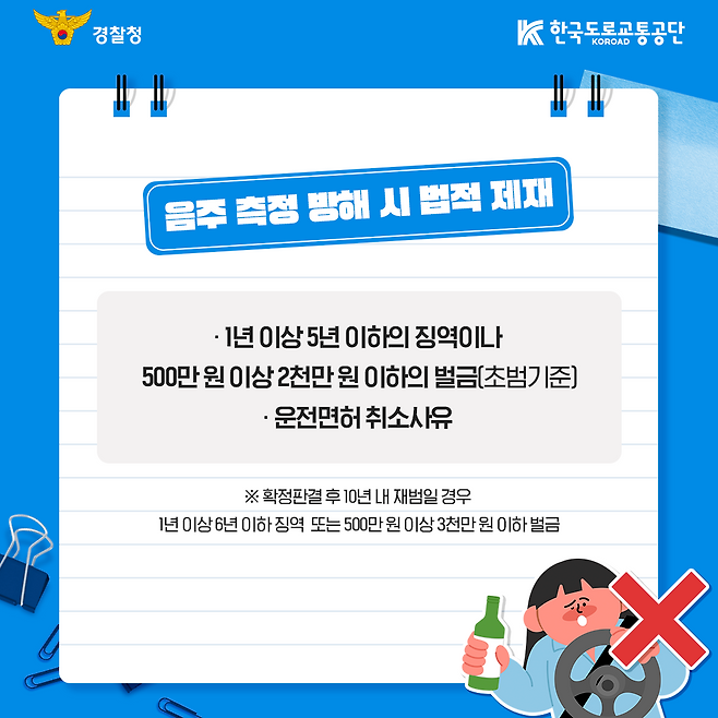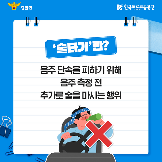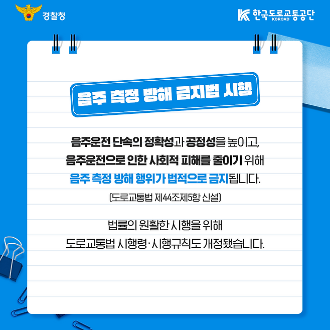 경찰청과 한국도로교통공단은 이번 개정 도로교통법 및 시행령의 주요 내용을 알리는 카드뉴스를 20일 공개했다. 개정안은 음주 상태로 차량이나 자전거 등을 운전한 뒤 음주 측정을 방해할 목적으로 술을 추가로 마시는 행위를 '음주 측정 방해'로 규정하고 이를 금지했다.