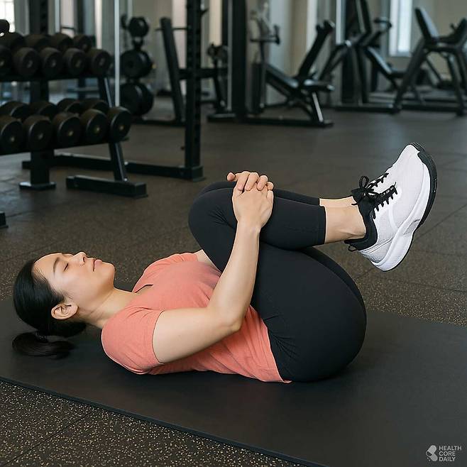 바닥에 등을 대고 눕는다. 두 무릎을 가슴 쪽으로 끌어안는다. 허리를 바닥에 밀착시키고, 두 손으로 정강이를 감싼다. 이때 턱은 살짝 당겨서 목이 긴장을 풀도록 한다. 그대로 30초 유지한다. 허리와 골반이 부드럽게 늘어나며, 하루 종일 압박됐던 허리 근육이 이완된다.
