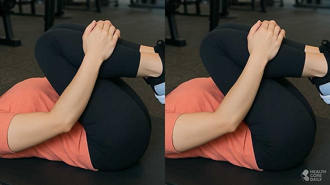호흡은 천천히 길게 뱉는 게 중요하다. 복식호흡으로 배가 위아래로 움직이는 걸 느낄 수 있어야 한다. 한쪽 다리씩 따로 끌어안아도 된다.