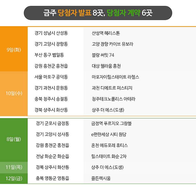 다만 1주차에 분양을 성공적으로 마친 단지들은 수요자들이 충분히 관심을 가질 만한 입지, 가격, 상품성 등을 두루 갖추고 있던 곳들로, 여전히 많은 단지들은 순위 내에 청약을 마치지 못하고 있습니다. 따라서 아직은 분양시장의 회복 등을 논하기는 일러 보입니다.