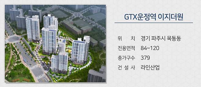 라인산업이 경기 파주시 운정신도시에서 ‘GTX운정역 이지더원’을 분양합니다. 하반기 개통예정인 GTX-A 운정역이 도보 5분거리에 있습니다. 주변에 초·중·고교 예정부지가 있어 통학하기도 쉽습니다.